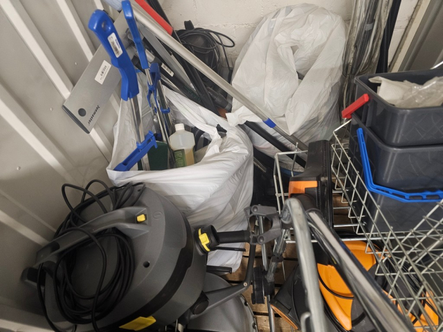 Myydään huutokaupalla kuvassa näkyvän varaston sisältö, vuokranantajan / haltijan lukuun.