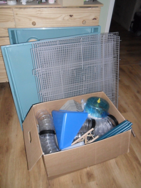 Iso kerroshäkki pyörillä ja tarvikkeitä, ( esim. freteille tai rotille), käytetty