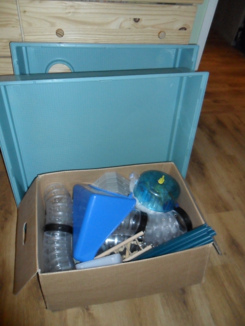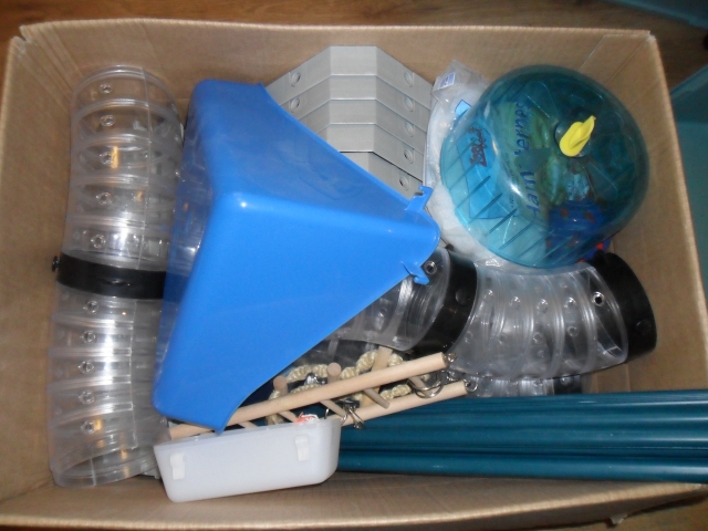 Mukana tulee monta muovitasoa kiinnityksineen ja tikkaita, juomapulloja ja kiipeilyvälineitä sekä muovinen pitkä putki.