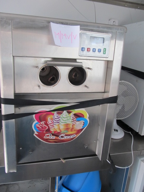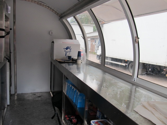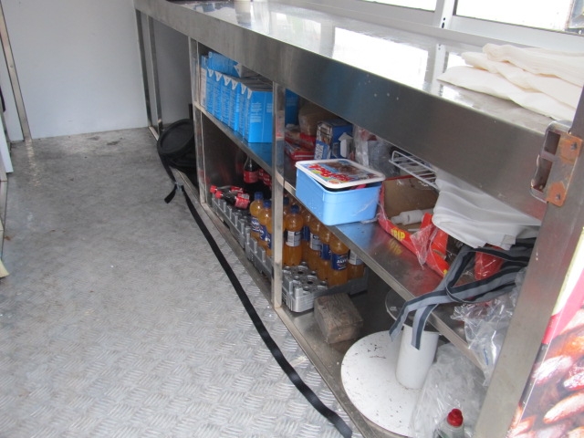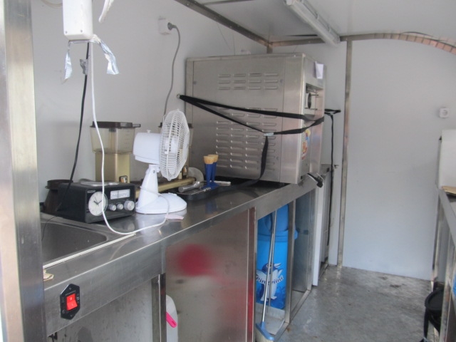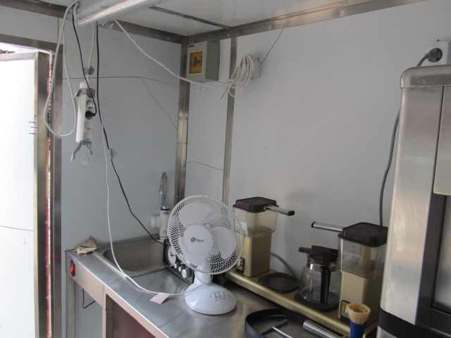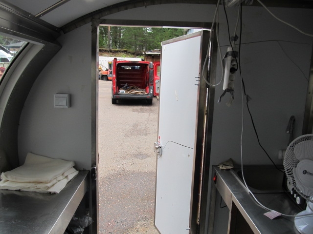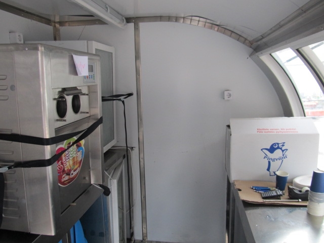 Myyntivaunu / kioski, varusteineen, rosteriset tiskipöydät, valaistua, lasiovellinen jääkaappi, pehmisjäätelökone.