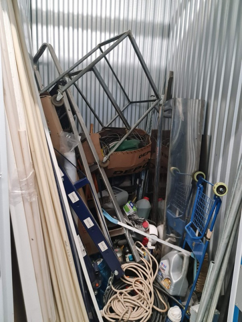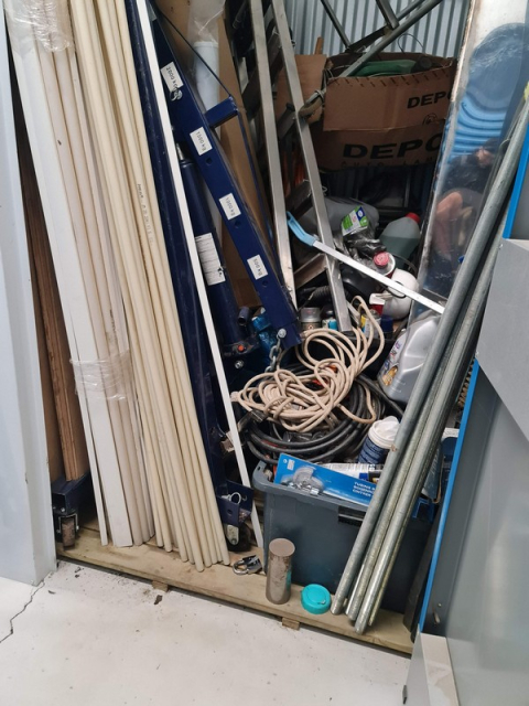 Myydään huutokaupalla kuvassa näkyvän varaston sisältö, vuokranantajan / haltijan lukuun.