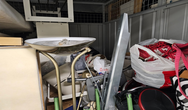 Myydään huutokaupalla kuvassa näkyvän varaston sisältö, vuokranantajan / haltijan lukuun.