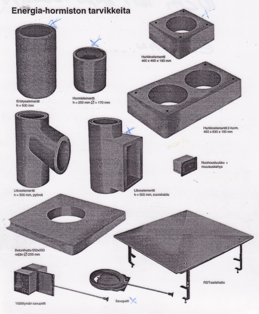 Runko eli Harkkoelementit , Eristyselementti ja Hormiputkielementti.