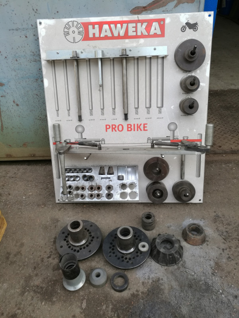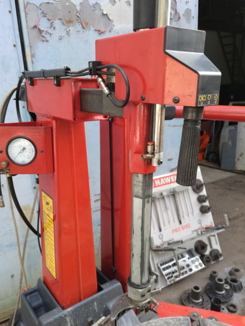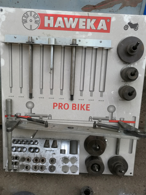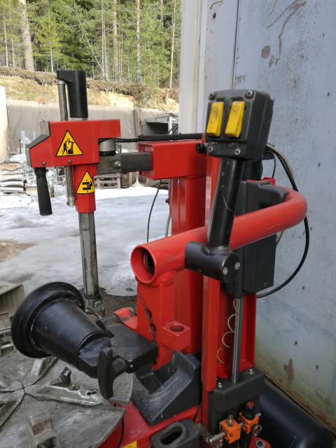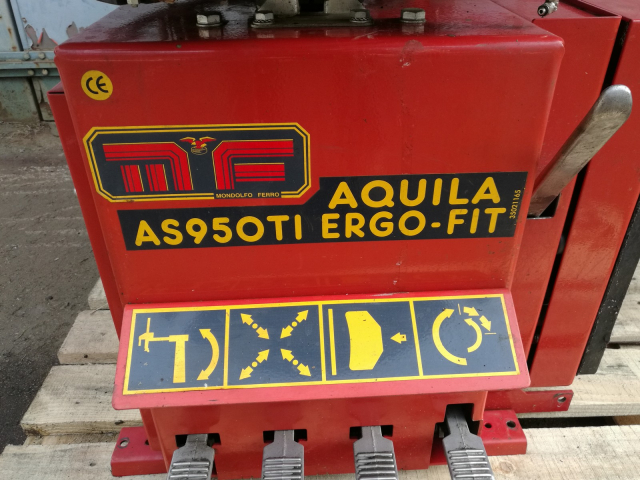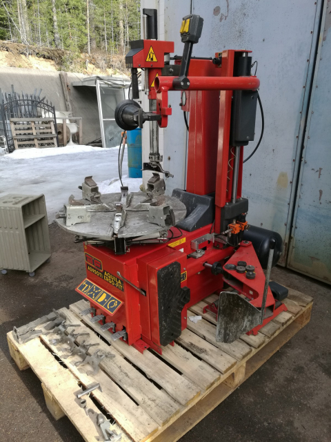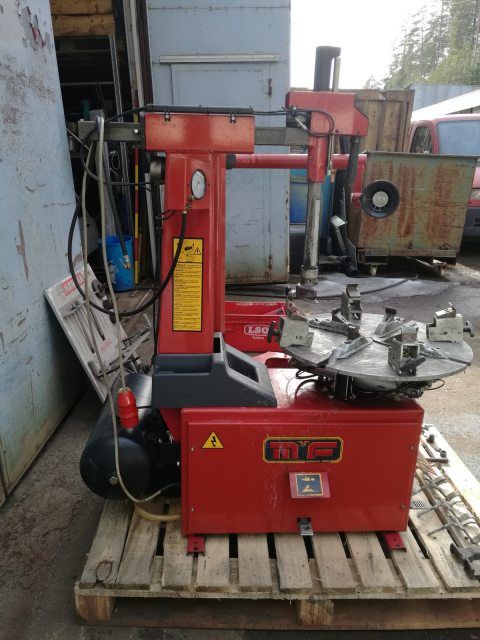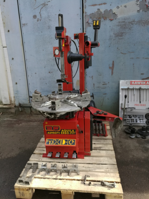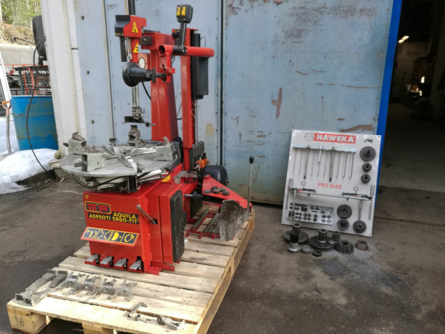 Kuvien mukainen monipuolinen rengaskone Mondolfo Ferro Aquila AS950TI Ergo-Fit, käytetty sekä MP renkaiden vaihtoon tarvittava työkalusarja Haweka Pro Bike