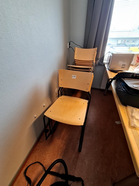 Kuvien mukainen: Erä Pinottavia vanerituoleja 12 kpl, Iskun Matti-tuolisarjaa