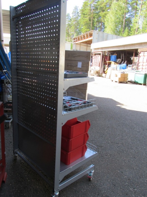Kuvan mukainen kokonaisuus pyörillä oleva metalli hyllykkö, mukana siis 3 hyllyä ja n. 15 piikkiä.