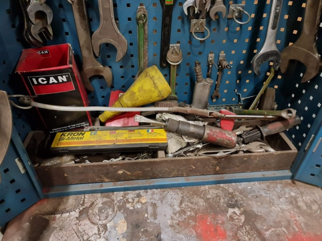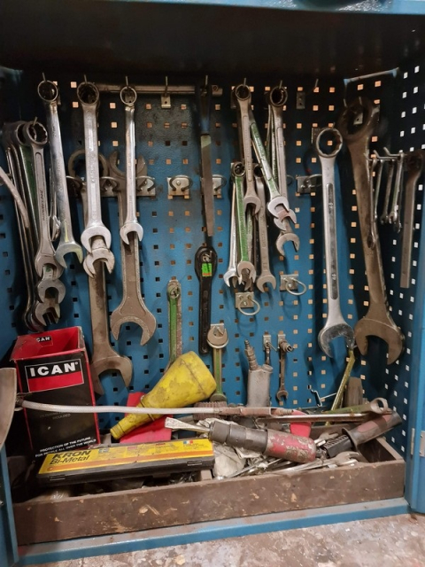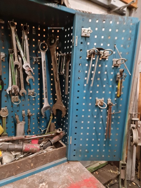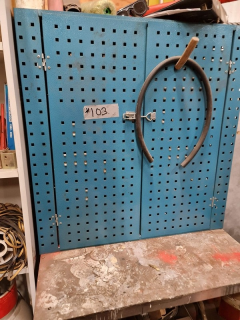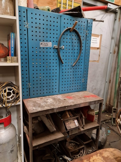 103. Reikälevykaappi hyllykkö pyörillä ja työkalut