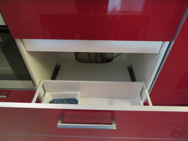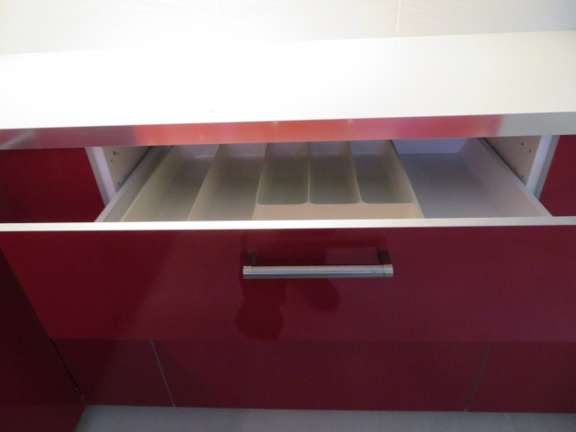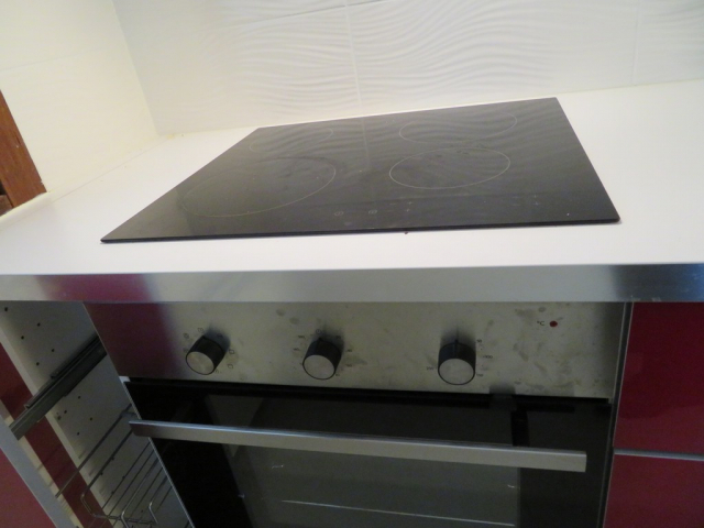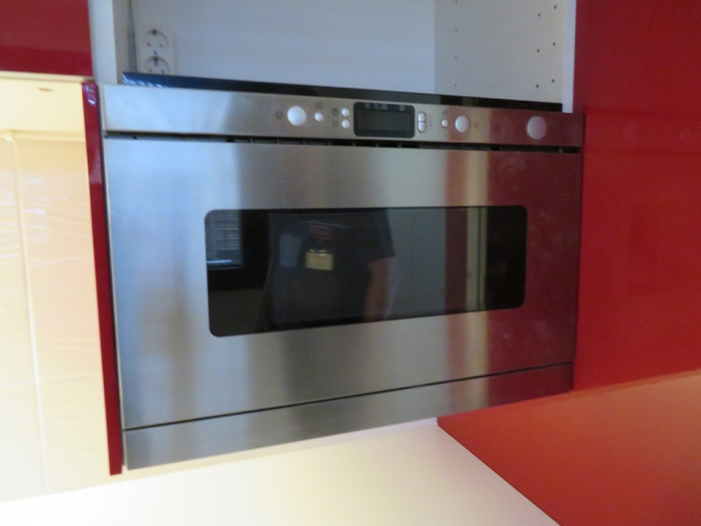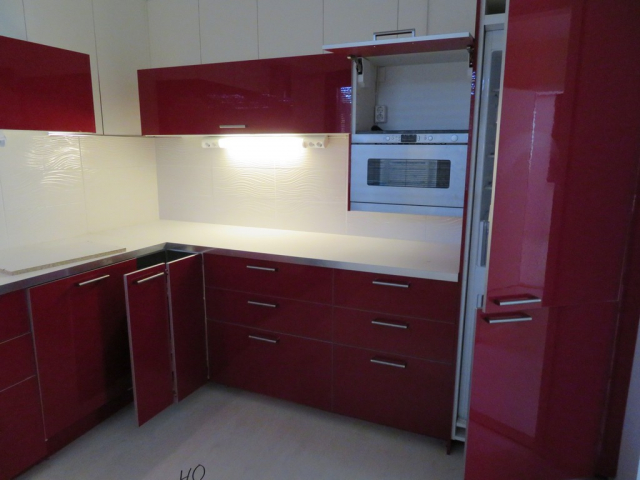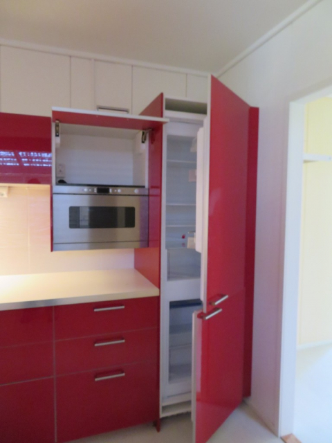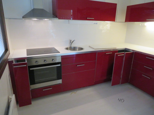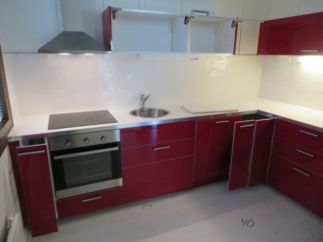 Ikea punainen keittiö kokonaisuus, yläkaapit, alakaapit, liesituuletin, induktioliesi, tiskiallas, uuni, jääkaappi pakastimella (161)