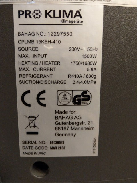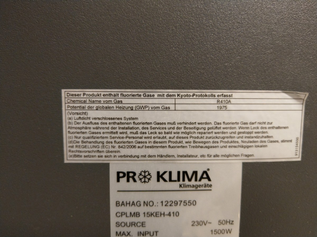 Ilmastointilaite Pro Klima Klimageräte CPLMB 15KEH-410, käytetty