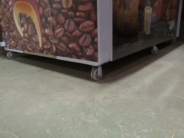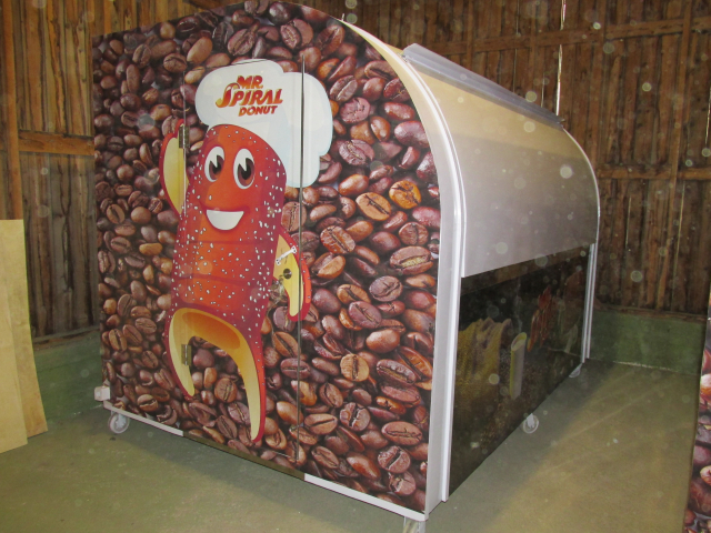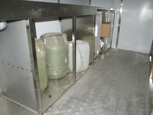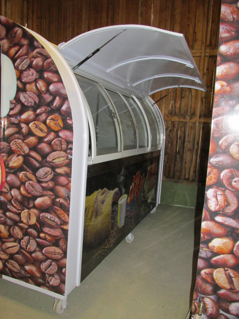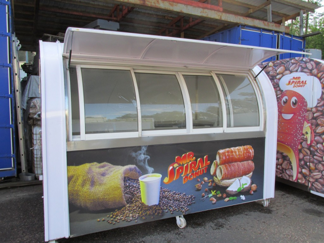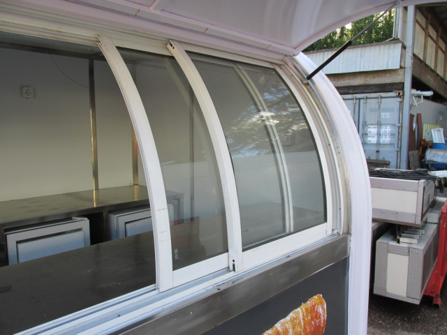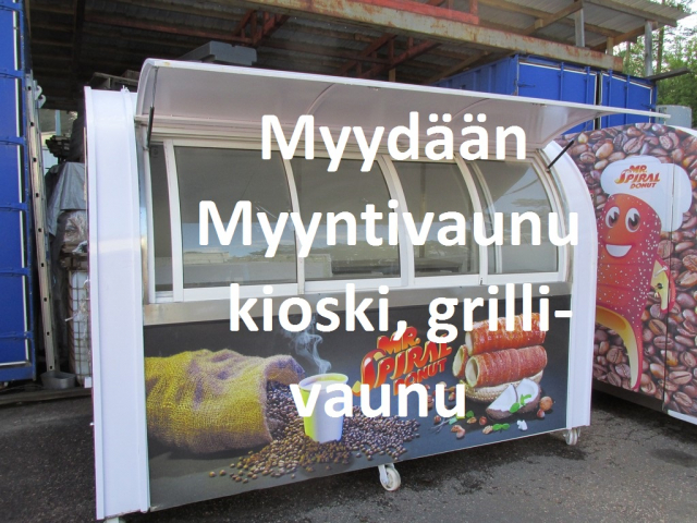 Myyntivaunu / kioski / grillivarusteineen, rosteriset tiskipöydät, valaistua, lasiovellinen jääkaappi.
