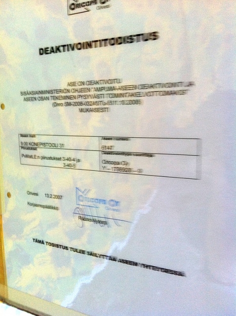 Deaktivoitu, kuvassa siitä todistus, joka on kiinnitetty vitriinin takakanteen.