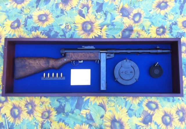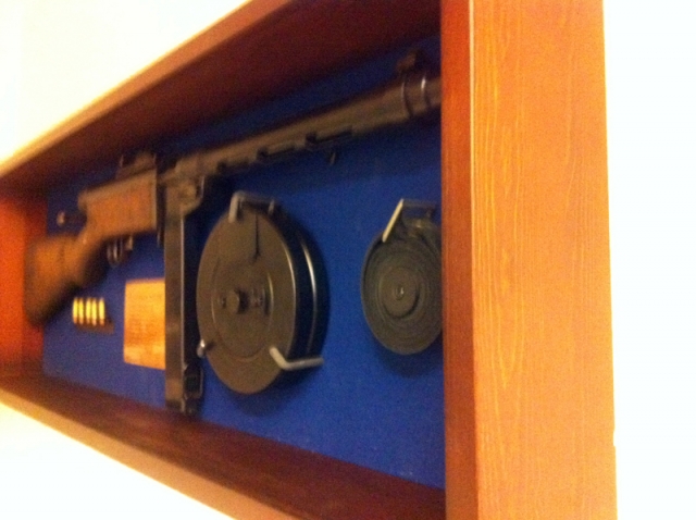 Vitriinistä löytyy aseen lisäksi tankolipas, rumpulipas, hihna ja mallipatruunoja.